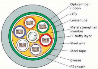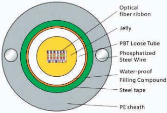 | Optic Fibre Ribbon in central loose tube corrugated steel tape & loose tube bound together with heat melting glue.2 pieces of paralleled steel wire within PE sheath |